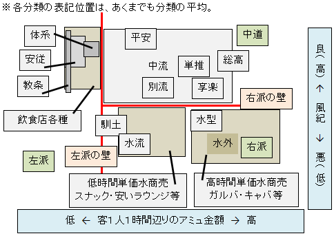 ◇馴土系。まず、彼らの土台の店舗の常識に準じ、その傾向は治安の悪い繁華街の個人の飲食店。さらに、接待に抵触しない業態の常識のまま「接待に抵触するサービス」を行う。