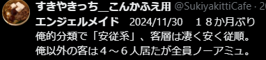 ◇某転生食堂。単推系になり損ねの安従系。キャスト全員が転生なためか自分の客への偏重が際立った、それと、単推し系と言うには気合いが乏しく、結果、安従系並の気概で単推し的な振る舞いをする有様だった。